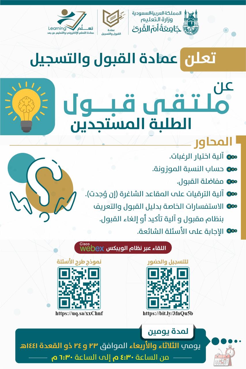 جامعة أم القرى On Twitter إعلان تدعوكم عمادة القبول والتسجيل بـ جامعة أم القرى لحضور ملتقى قبول الطلبة المستجدين 24 23 ذو القعدة 1441هـ 4 30 م 6 30 م للتسجيل Https T Co Viythbmlun Https T Co Jwkkgxobex