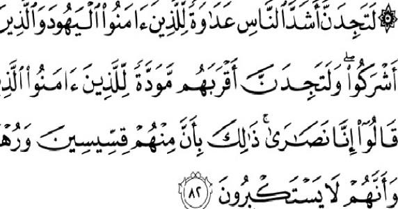 ل ت ج د ن أ ش د الن اس ع د او ة ل ل ذ ين آم ن وا ال ي ه ود و ال ذ ين أ ش ر ك وا و ل ت ج د ن أ ق ر ب ه م م و د ة ل ل ذ ين آم ن وا ال ذ ين ق ال وا إ ن ا ن ص ار ى ذ ل ك ب أ ن م ن ه م ق س يس ين و ر ه ب ان ا و أ ن ه م ل ا